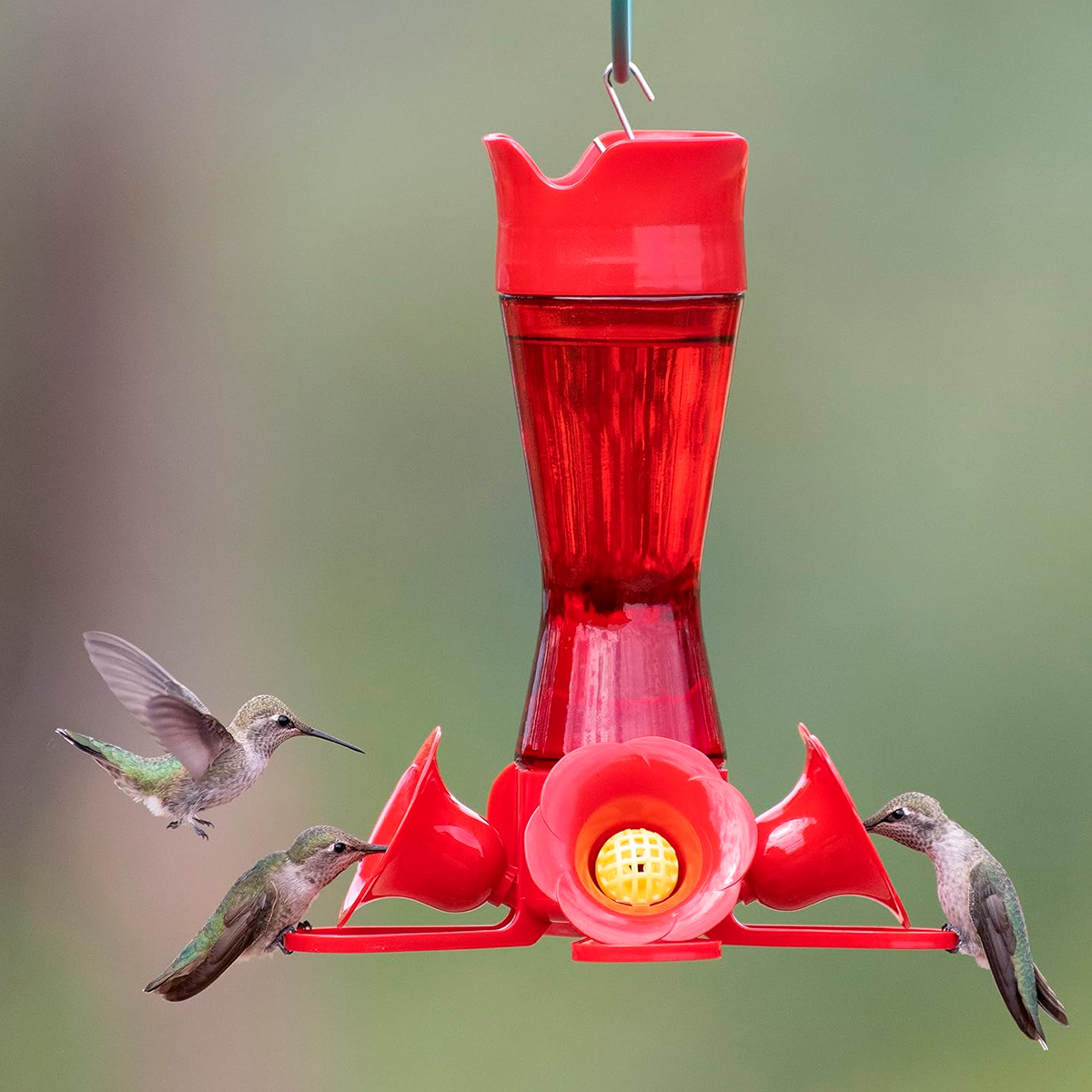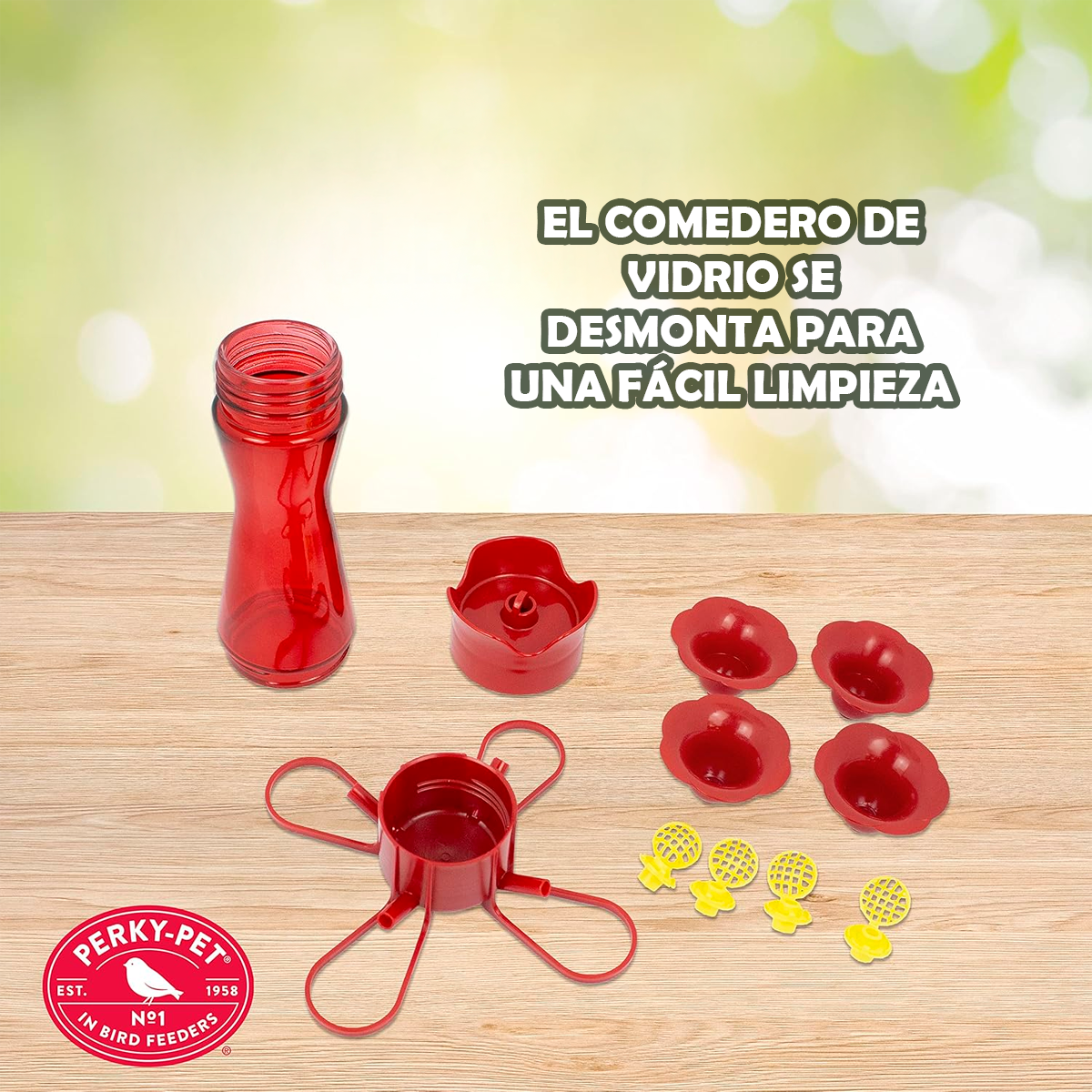 El bebedero para colibríes cuenta con cuatro puertos de alimentación, un foso para hormigas. Se conecta fácilmente a una rama por medio del gancho que viene con el bebedero o por medio de un soporte al suelo. El diseño es extremadamente eficiente con su forma con la que proporciona un amplio espacio para los colibríes para alimentarse. El depósito, hecho en vidrio irrompible o acrílico hace que sea fácil controlar los niveles de néctar y desenrosca fácilmente de la base de conexión para una rápida limpieza y llenado.