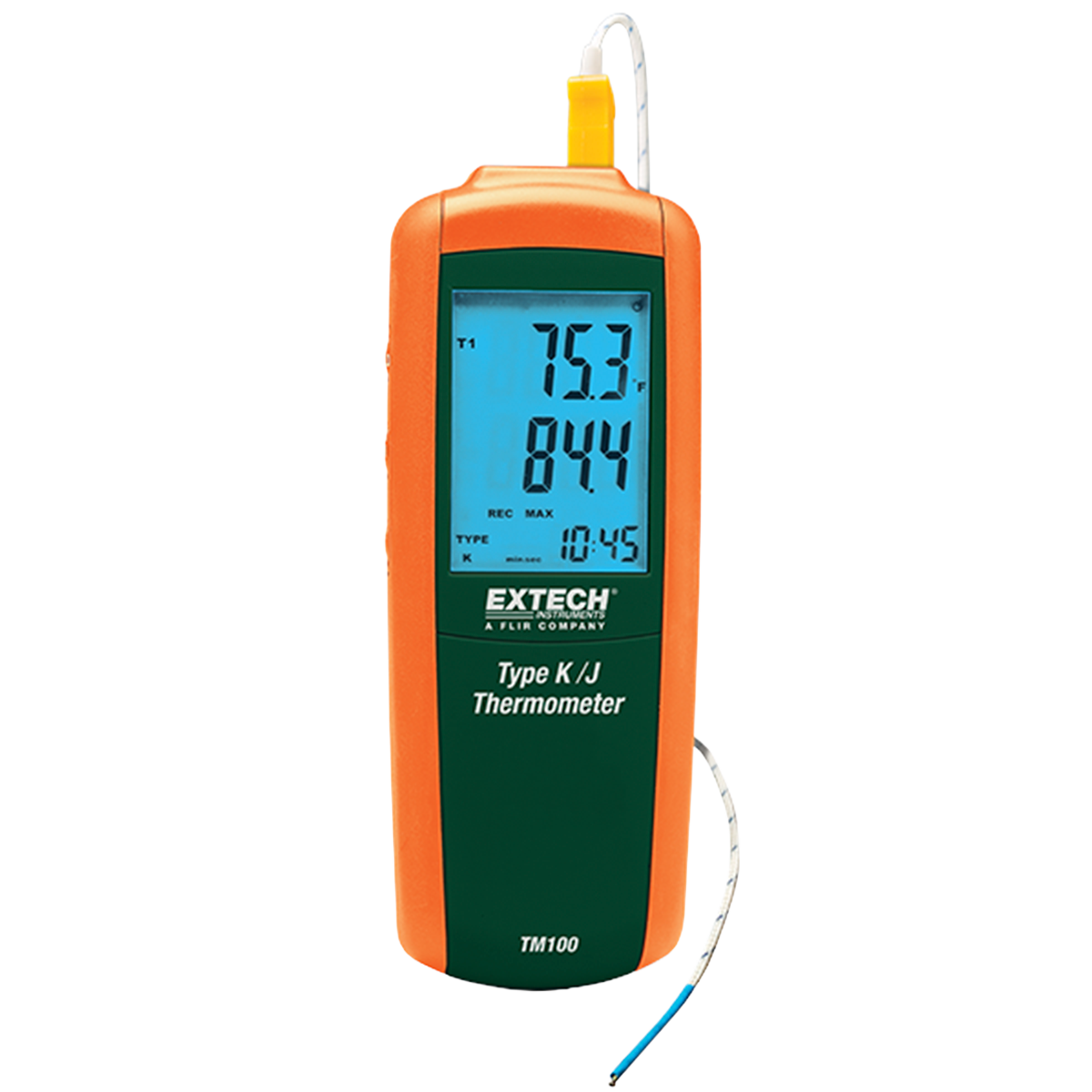 El termómetro de entrada única tipo J/K TM100 de Extech tiene un amplio rango de temperatura de -200 °C a 1372 °C (-328 °F a 2501 °F) para mediciones tipo K y de -210 °C a 1100 °C (-346 °F a 2012°F) para mediciones Tipo J. Tiene una alta resolución de 1 °C/0,1 °F, así como una gran pantalla LCD retroiluminada con lecturas en °C, °F o Kelvin. La función de retención de datos congela la lectura en la pantalla y la pantalla muestra el máximo/mínimo/promedio. Las lecturas capturan una marca de tiempo relativa. Además, la tecla de compensación se utiliza para la función cero para realizar mediciones relativas. Viene con apagado automático con una función de desactivación. Este termómetro viene completo con la sonda de temperatura de alambre de talón tipo K y una batería de 9 V.